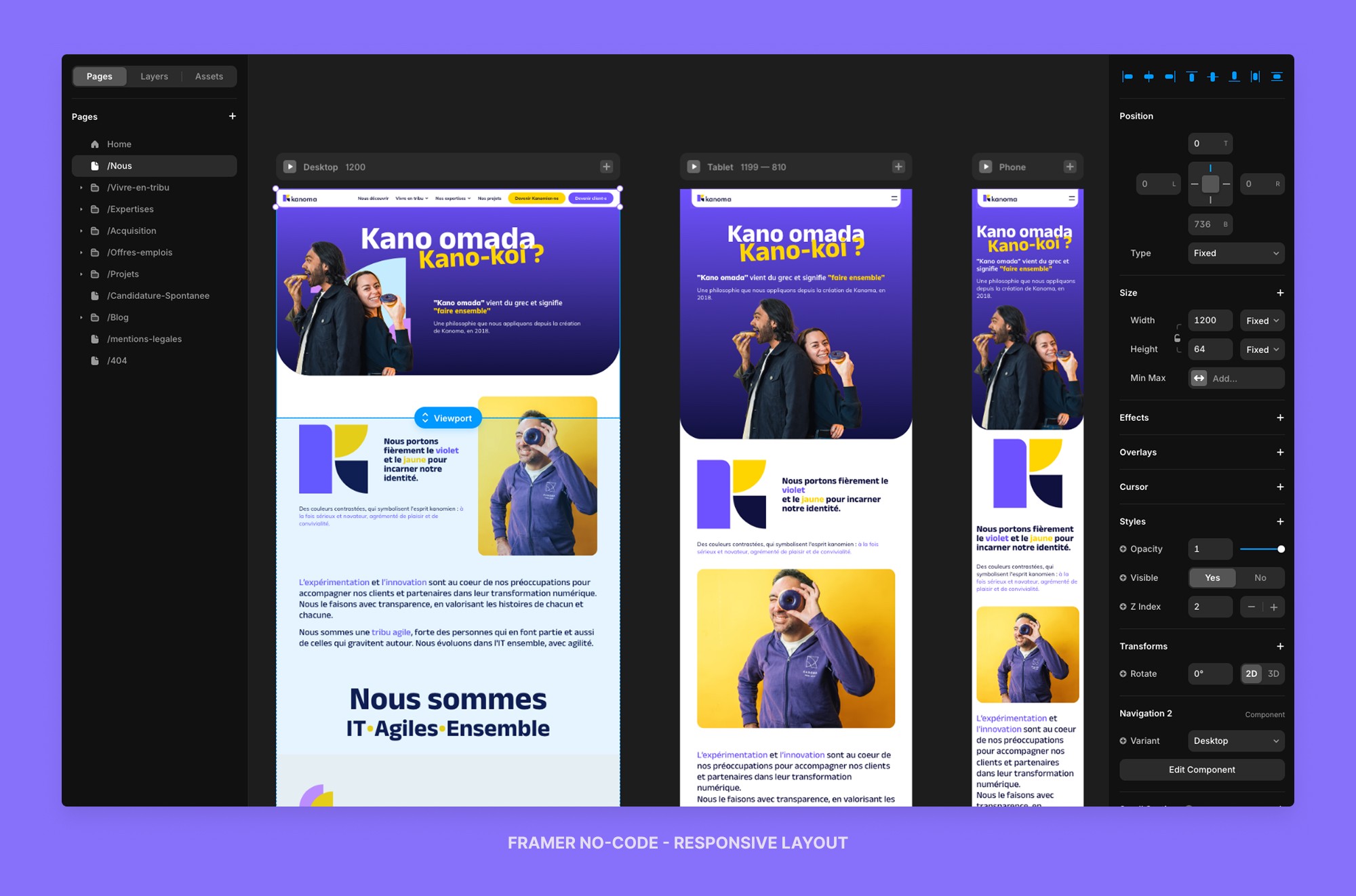 Once the mock-ups had been validated, I carried out the integration on Framer, totaling 15 pages, two CMS collections, adapted to three breakpoints for a fluid experience on desktop, tablet and mobile. Animations were added to energize the interface, making the experience more interactive and engaging. Technical adjustments were made in collaboration with Pierre, Tech lead at Kanoma, to ensure that the site was perfectly functional and optimized, with particular emphasis on Aria tags.