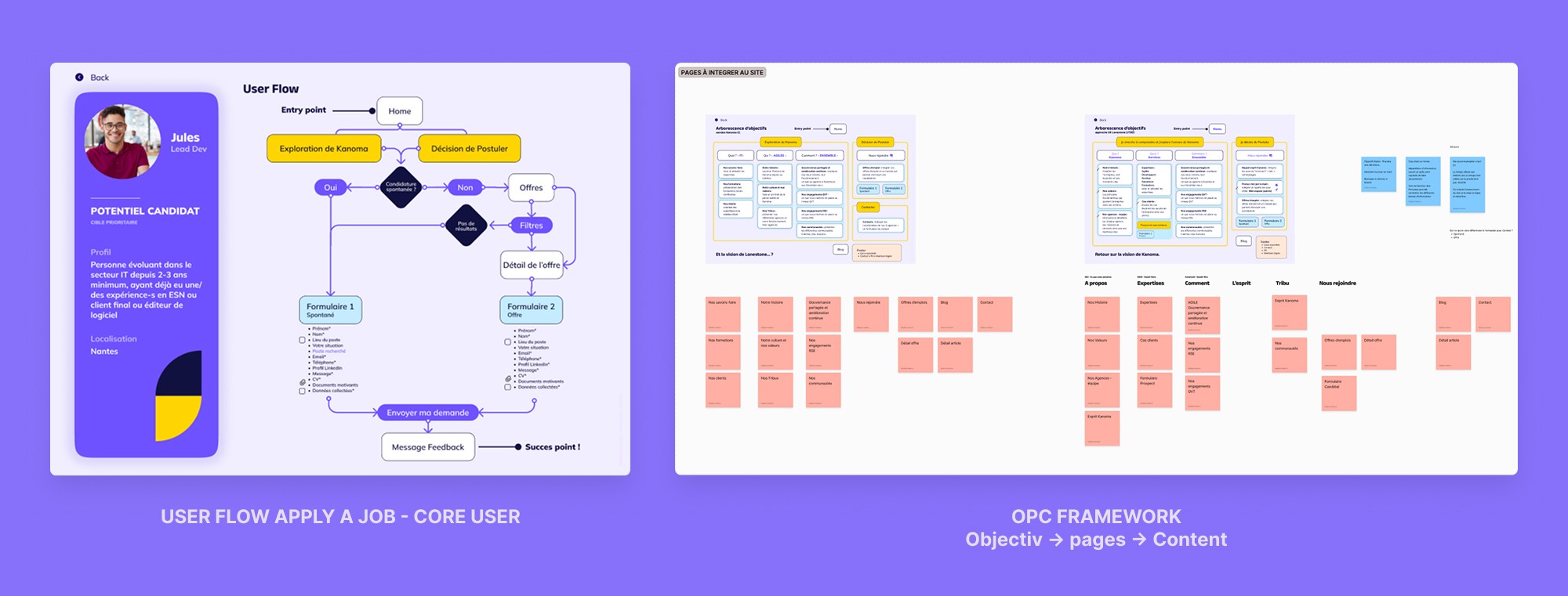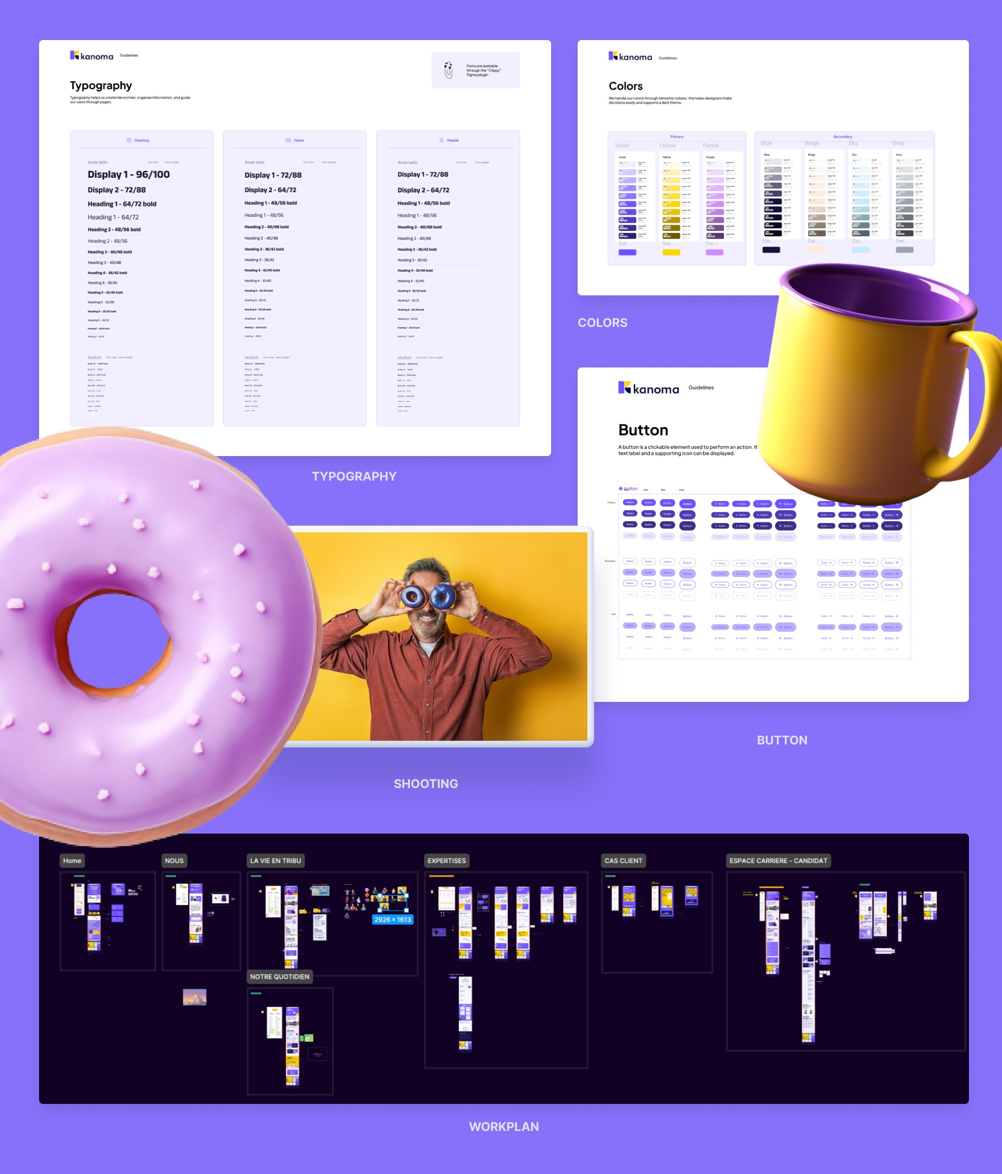 After the kick-off with Kanoma. In total autonomy with the customer team, I began with an in-depth audit of the existing system to identify strengths and areas for improvement. A workshop was organized to prioritize Kanoma's needs, understand their expectations and refine objectives, while taking into account their HR constraints. The focus was on their identity and community spirit to attract talent and prospects, while aligning the artistic with the functional.