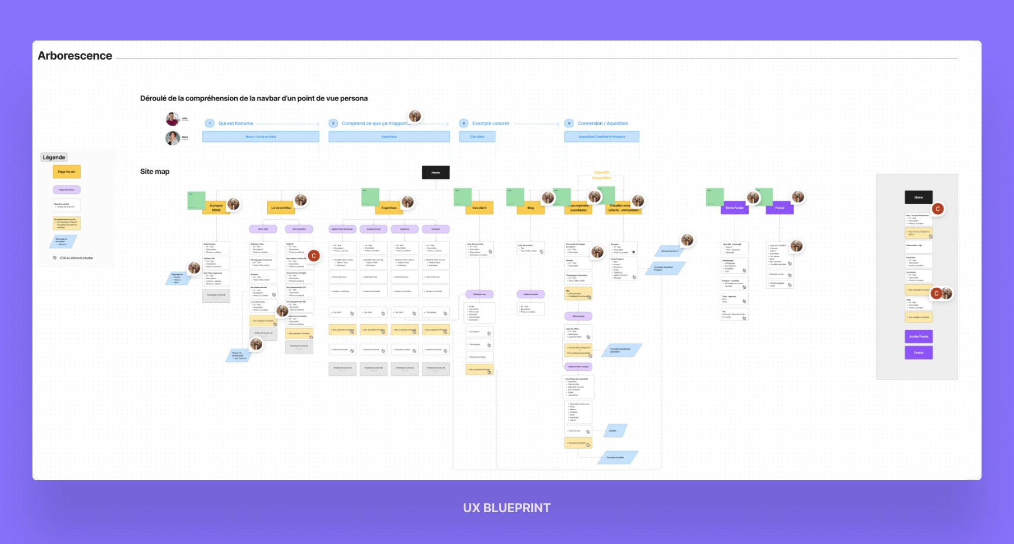 Once the objectives had been clarified, we defined an acquisition strategy and structured an optimized tree structure. I merged this tree structure with precise zoning to organize content efficiently, and created an UX Blueprint combining user flows, information architecture, and a site map to structure the experience before design. Collaboration was fluid thanks to asynchronous work with Claire, where she concentrated on text content and I on structure and user paths. Wireframes were avoided, as the upstream preparation was sufficiently detailed to allow us to move straight on to creating the UI mock-ups on Figma.